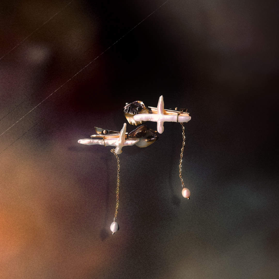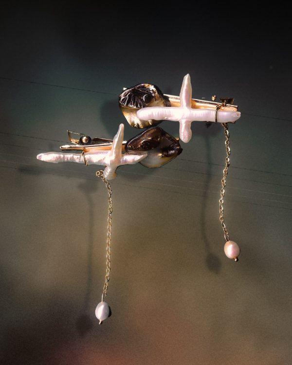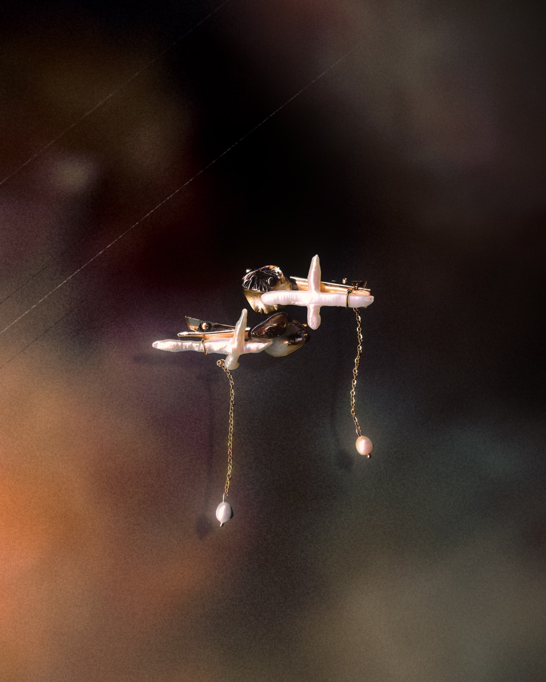 Made with gold plated hairclips, cross freshwater pearls, white freshwater pearls, peacock freshwater pearls, gold stainless steel chains. stainless steel jump rings and stainless steel eye pins.
