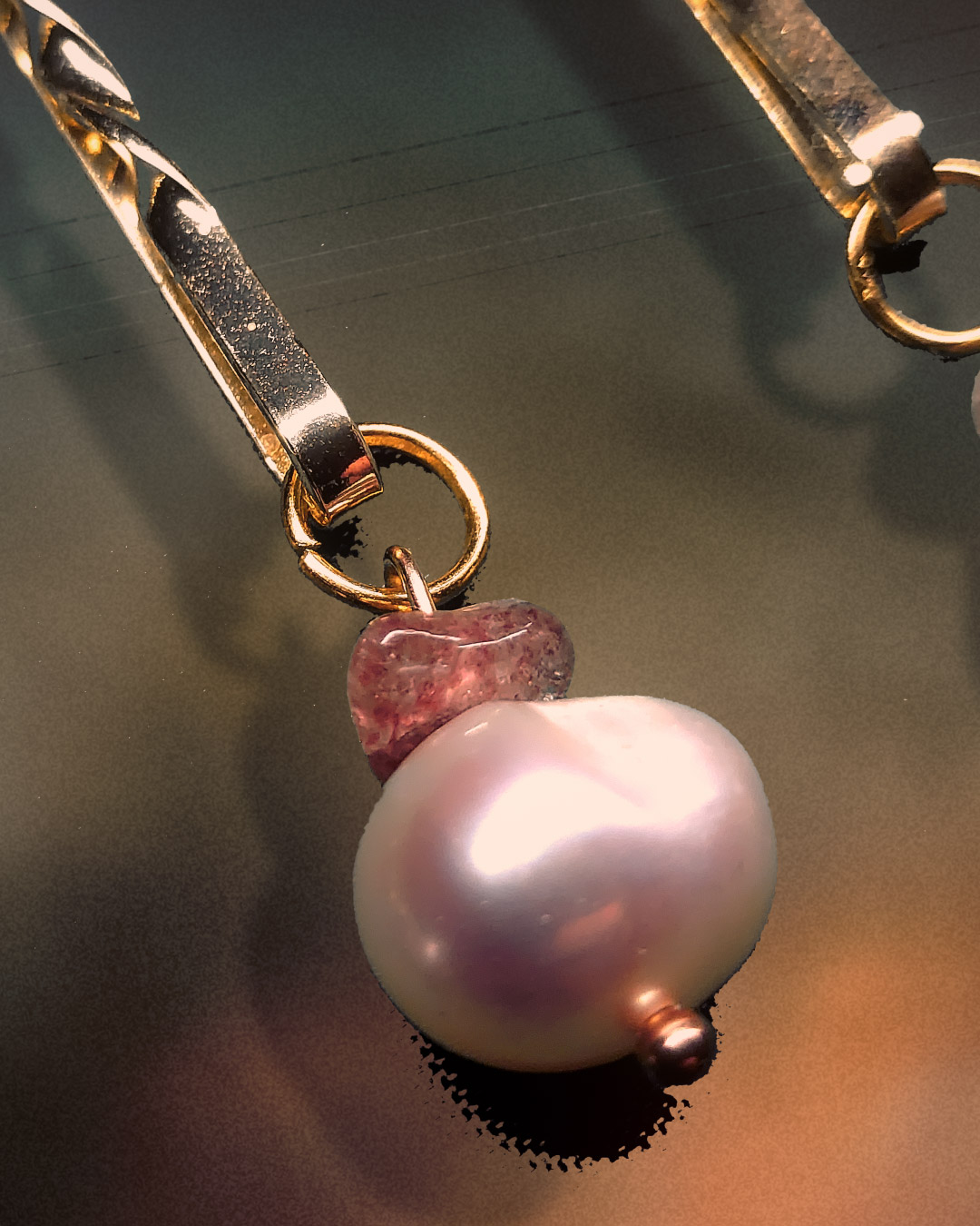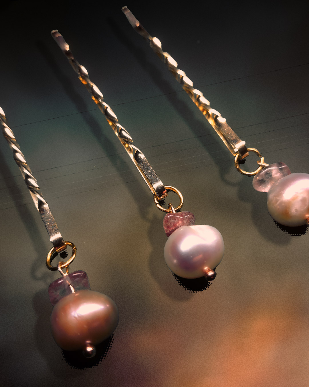 Made with gold plated hair pins, pink freshwater pearl, strawberry quartz, stainless steel jump rings and stainless steel eye pins.