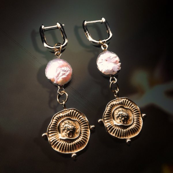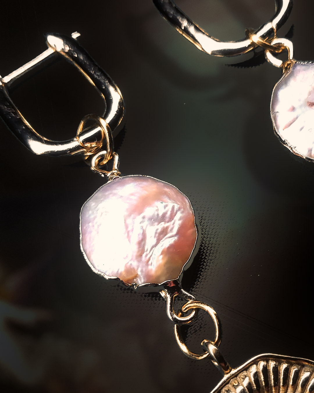 Made with gold stainless steel triangle earring hoops, white/pink round pink freshwater pearls, detailed gold stainless steel pendants, stainless steel eye pins and stainless steel jump rings.