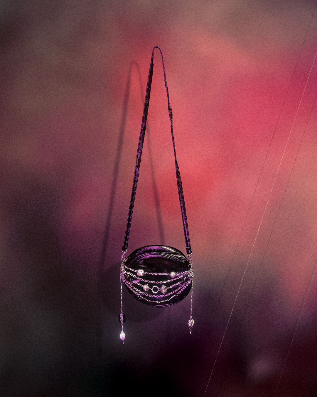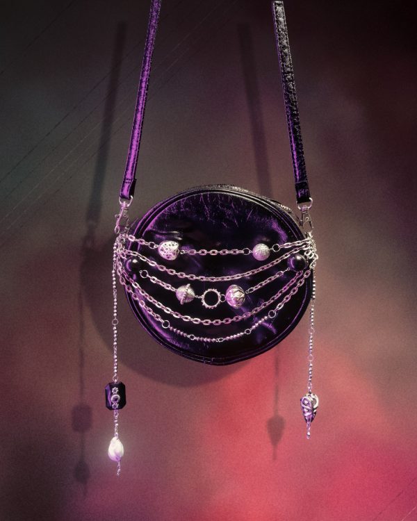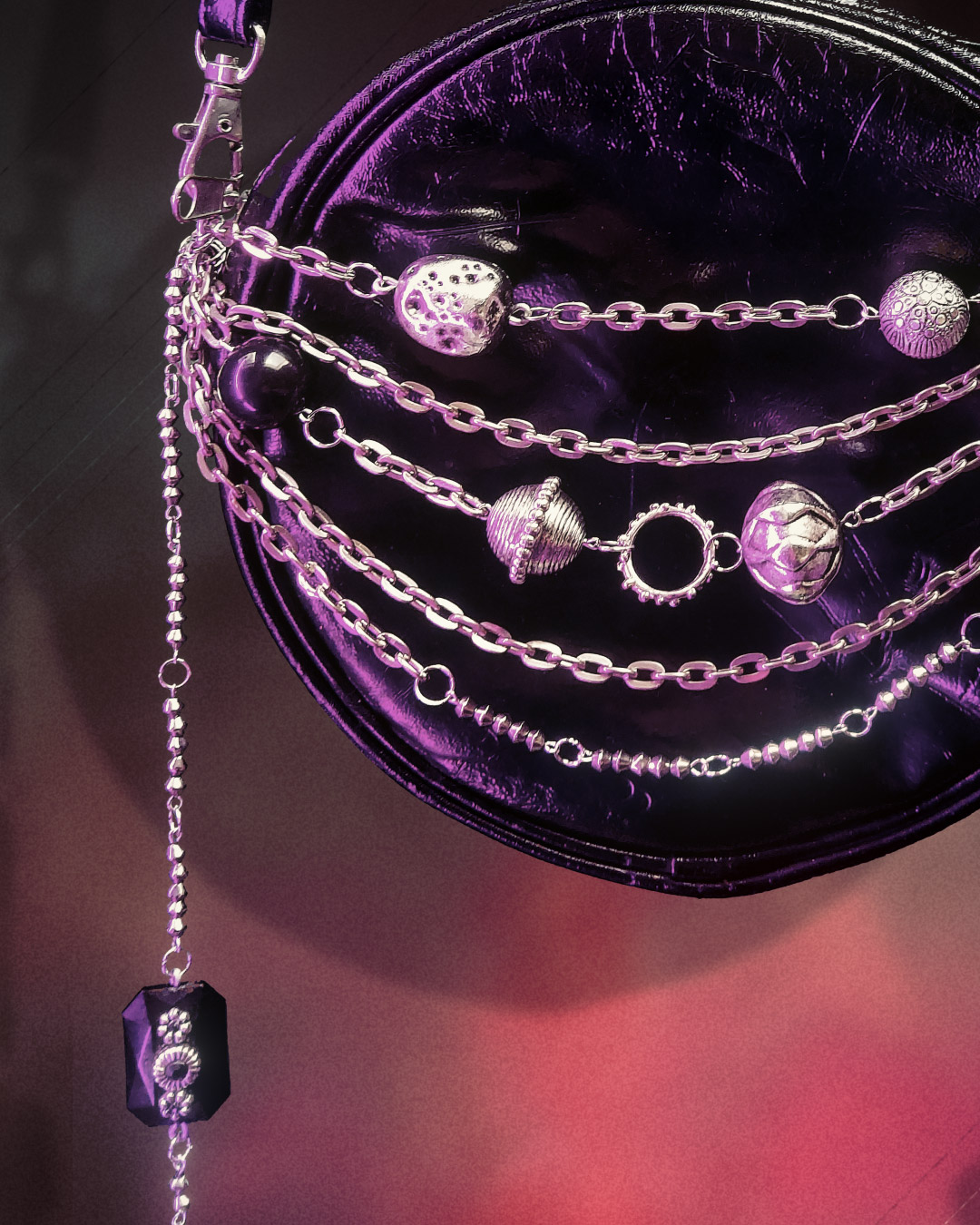 Made with silver plated chains, vintage silver plated beads, black beads and finished with our unique LIMBS OF LIANA logo. The handbag itself has a black latex look, one main pocket on the inside and a little zipper in the inside as well.
